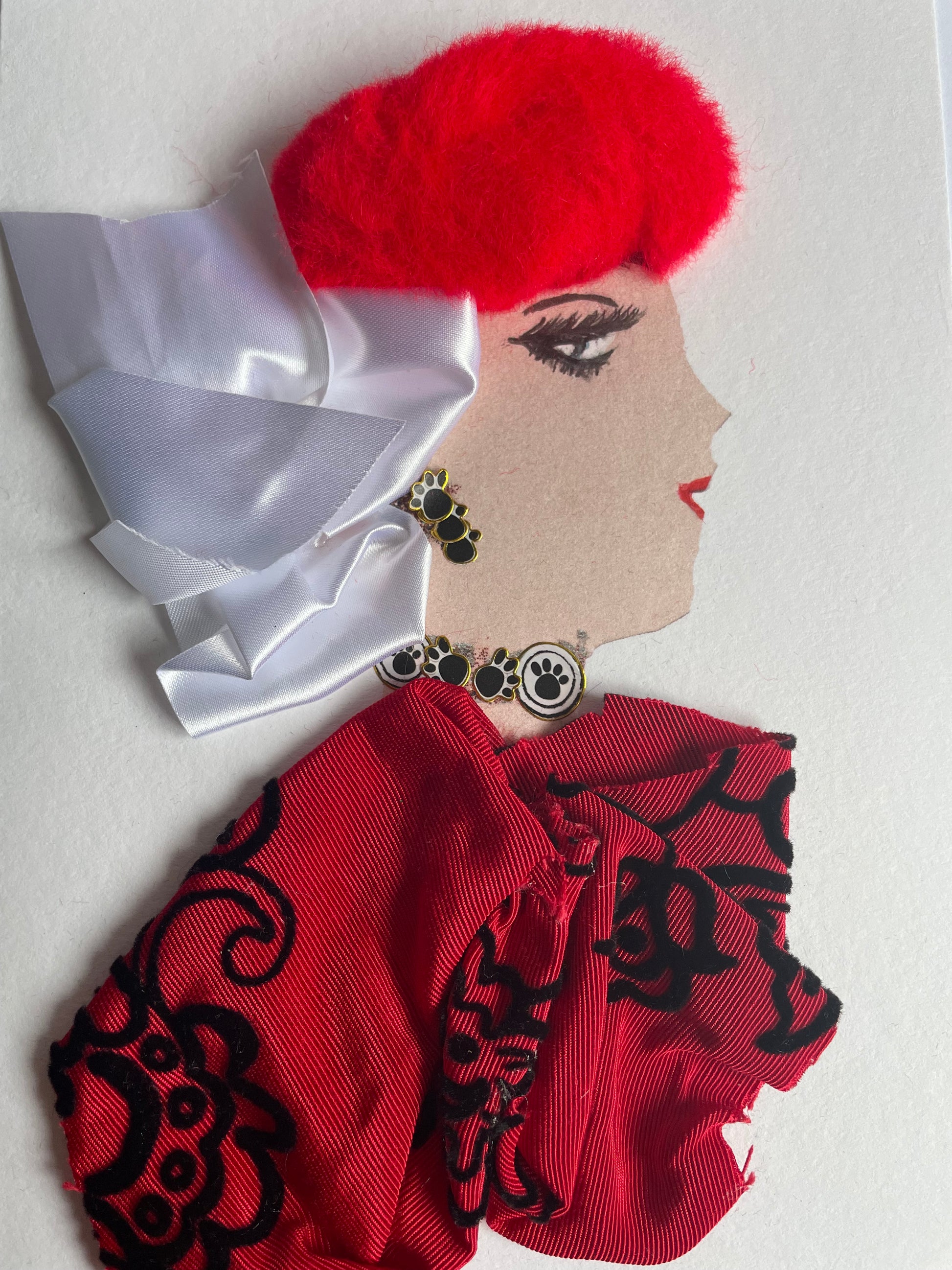 This card shows a woman who is wearing a blouse with a red and black floral pattern. It compliments her bright red hair. She also wears a white silk headpiece and jewellery with paw prints as a pattern.