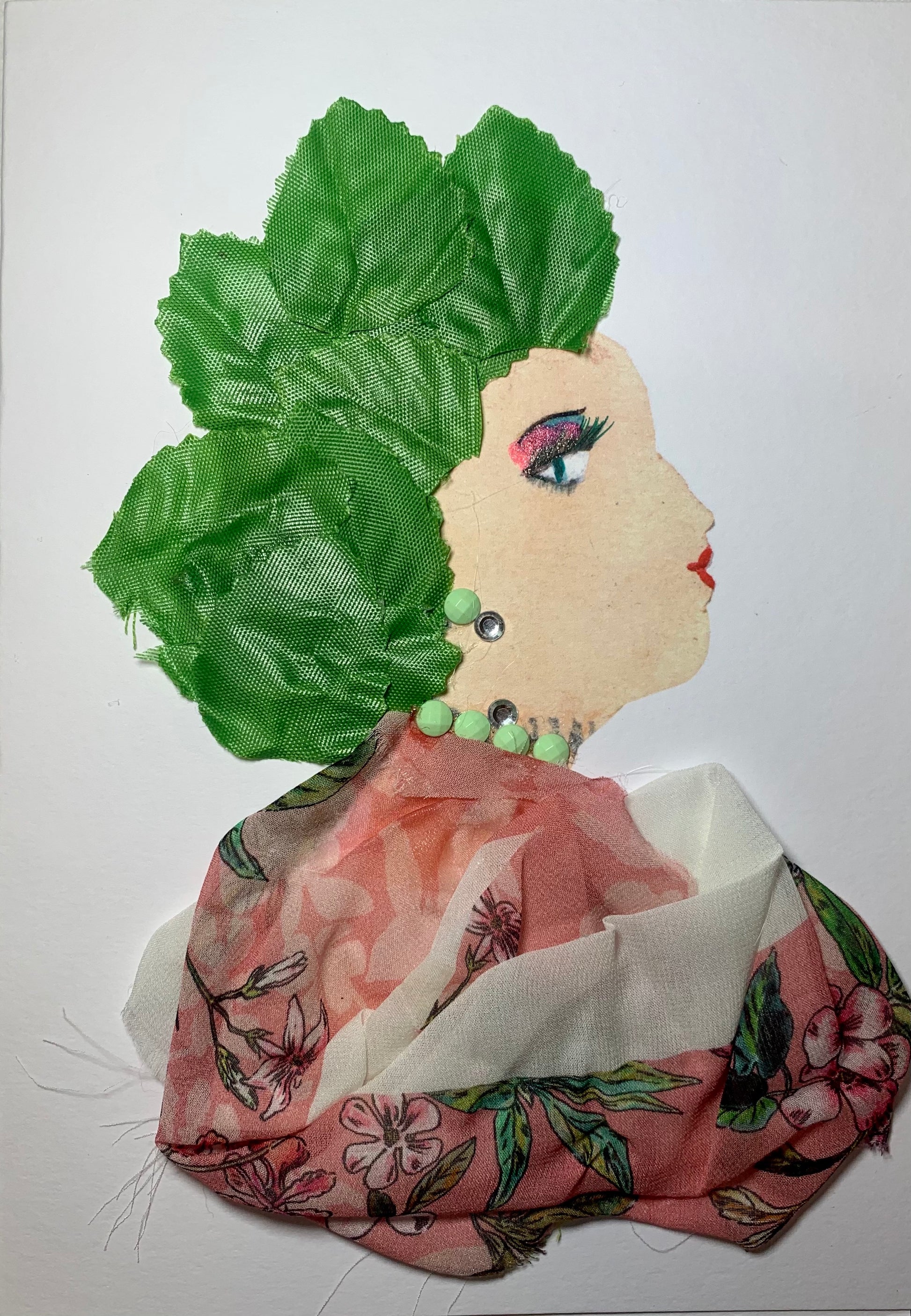 Nikki Neasden is wearing a sophisticated patterned pink blouse. She has leafy green hair with sage green beaded jewellery.