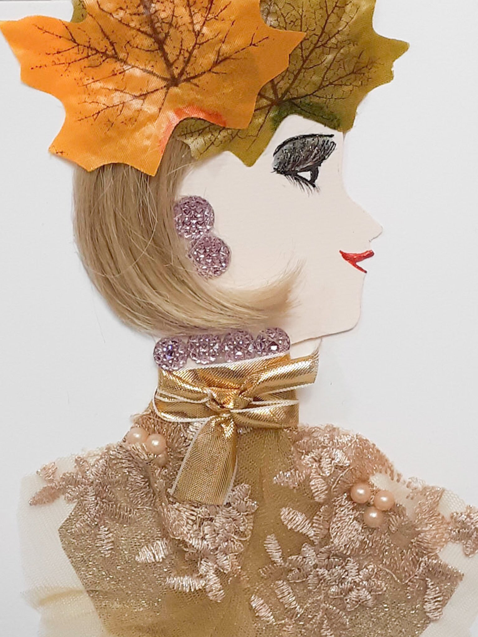 Nur is wearing a beautiful woodland attire with a yellow leaf in her hair, also wearing a matching diamond earring/necklace.