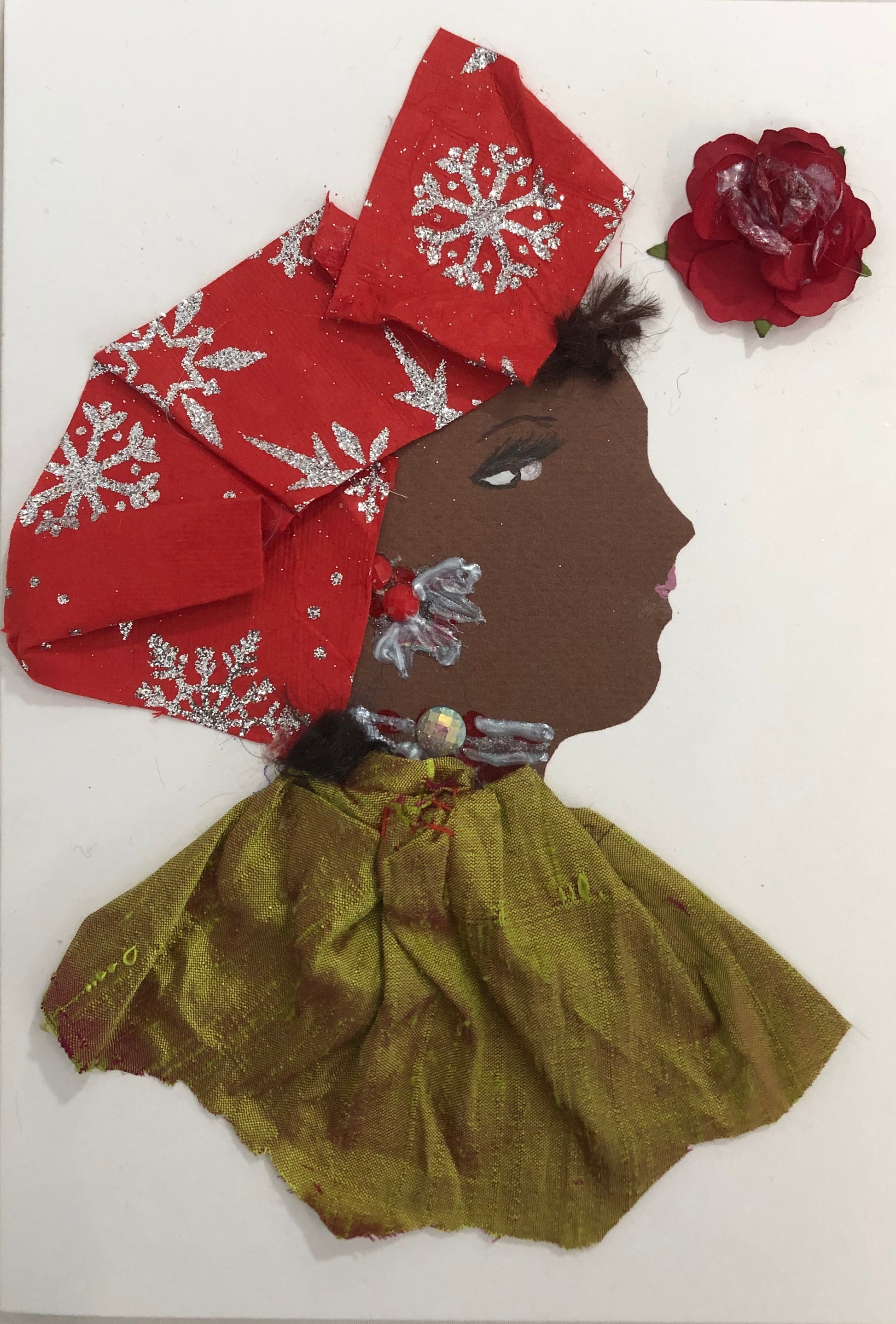 In preparation for her festive season, she thought she should wear olive and red. There is a red flower on the right.
