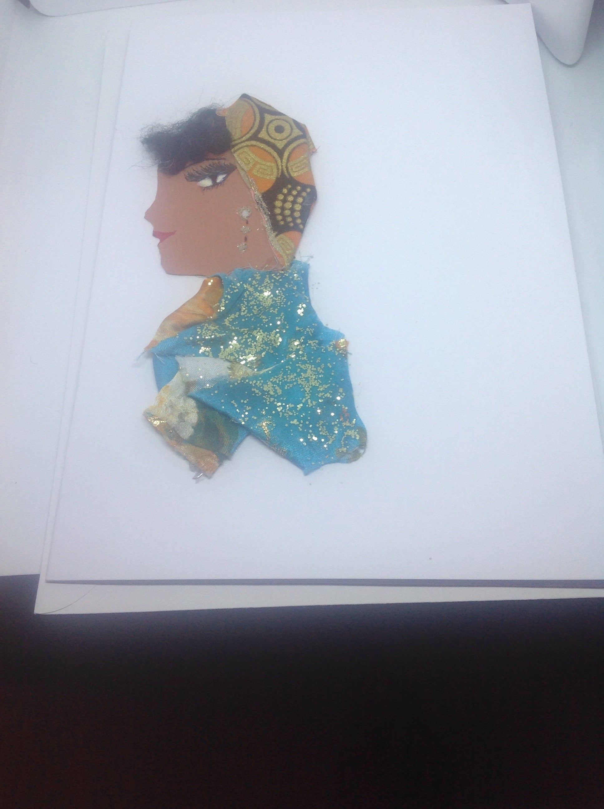 Jessie is wearing a blue and gold top with an orange, gold, and brown headpiece.