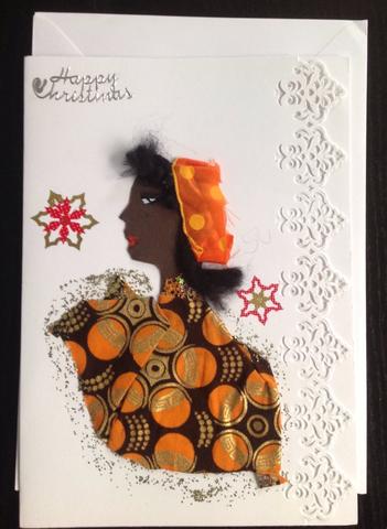 Zola Oakwood wears an orange and cold circle top with an orange headpiece. There are flowers around her in the background of the card. At the top left it says "Happy Christmas" in silver.