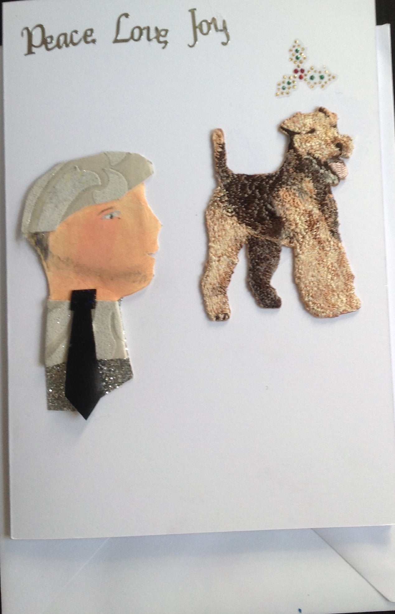 Peter is wearing a white shirt with a black tie. He also has a white hat on. Next to him on the right is a brown and black dog with a holly leaf above the dog's head. There are also the words "Peace Love, Joy" at the top left of the corner.
