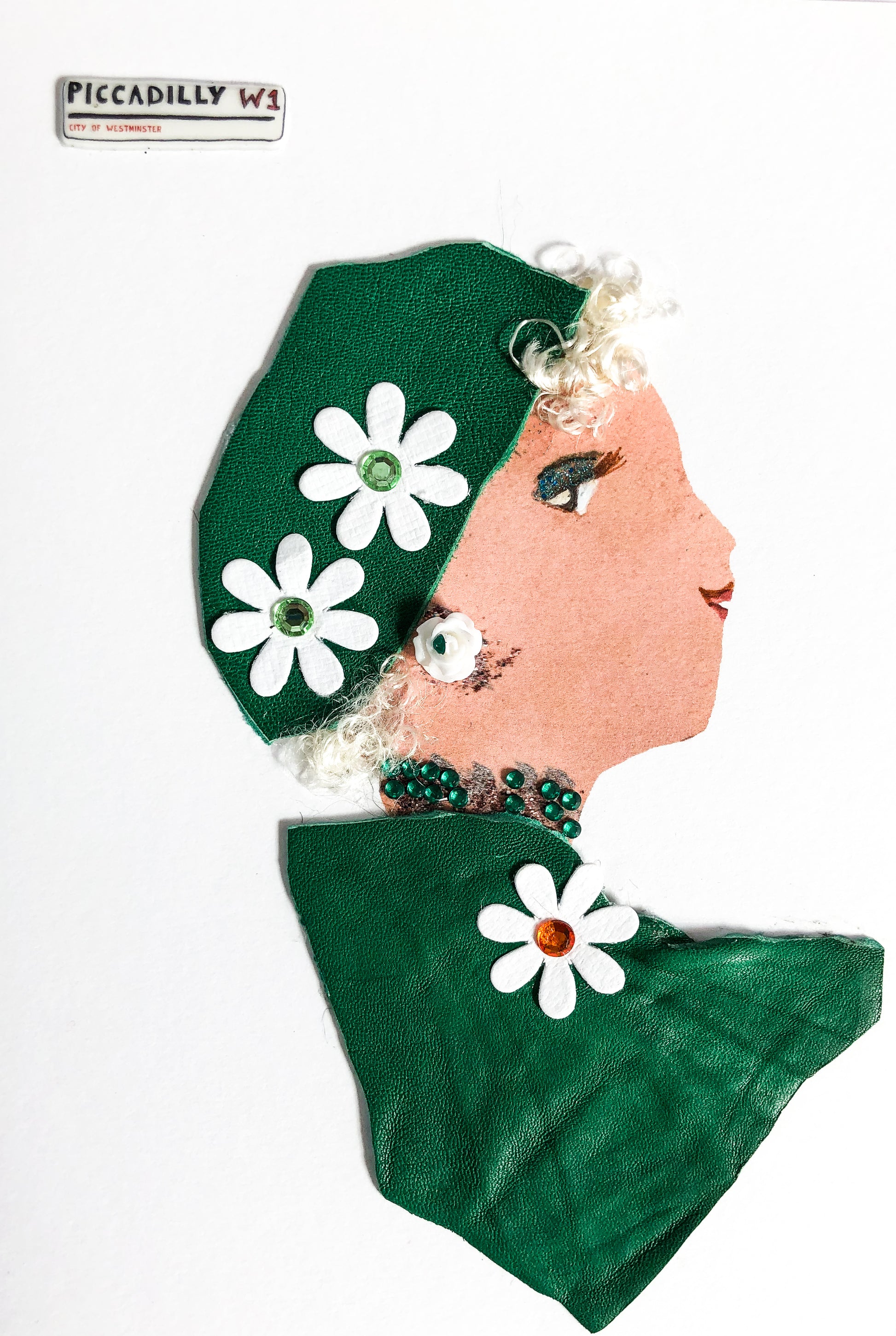 She wears a matching dark green blouse and hat with three white flowers on it. In the top left corner, there is a sign that says "Piccadilly."