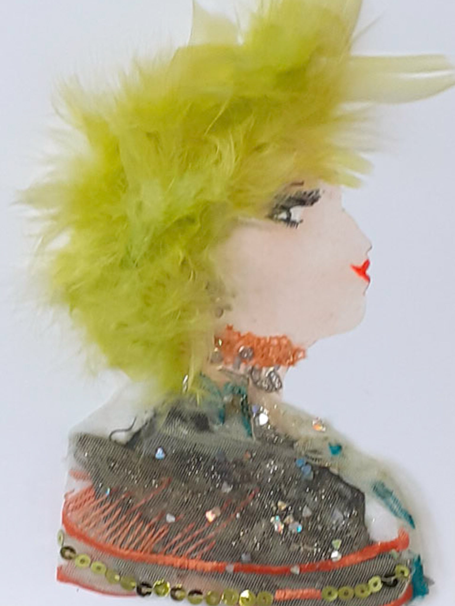 Pimlico is wearing a silver blouse with orange stripes and her messy yellow feathery hair.