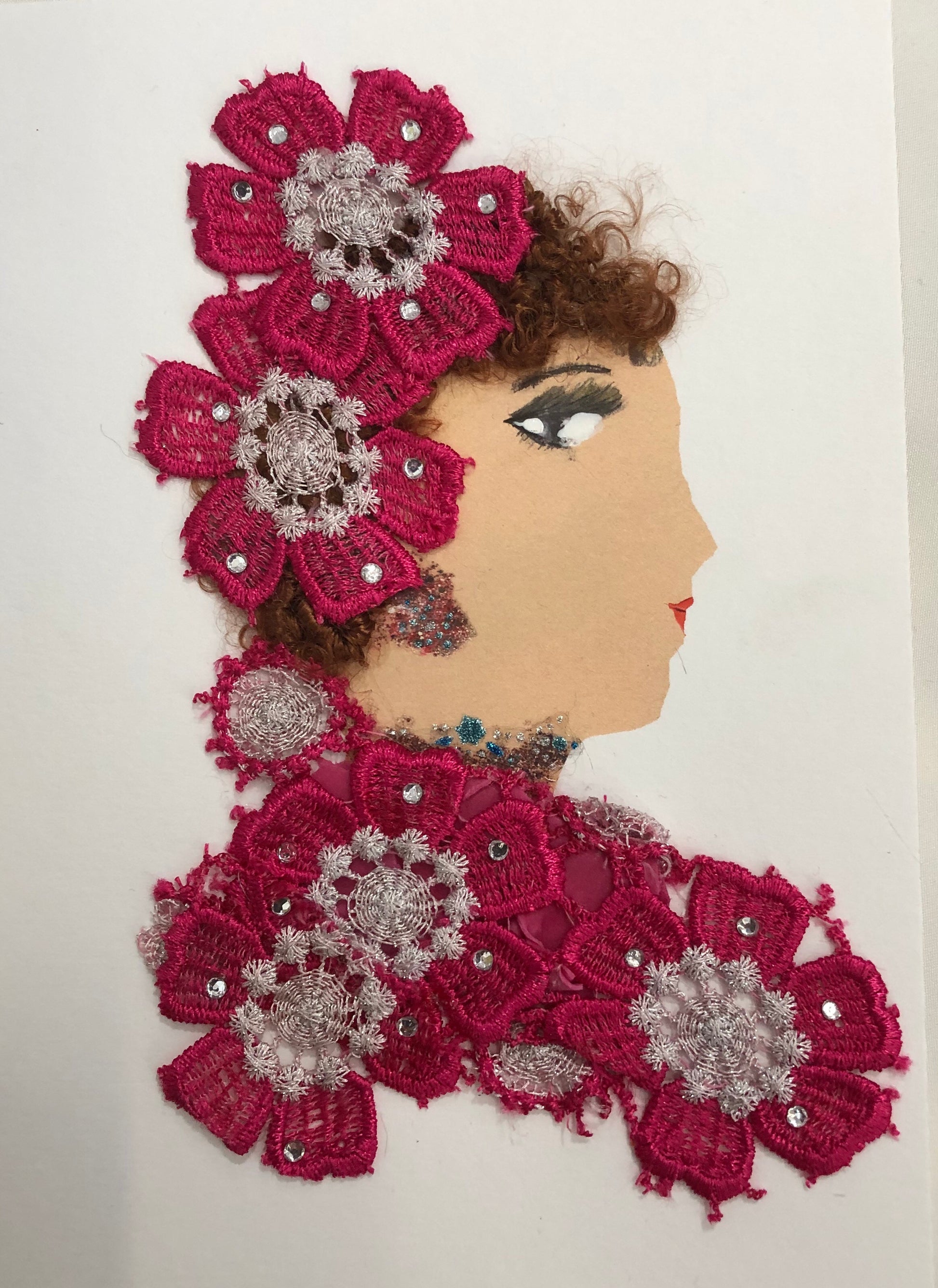 She is wearing a matching pink and silver blouse and headpiece. These match her earrings as well.