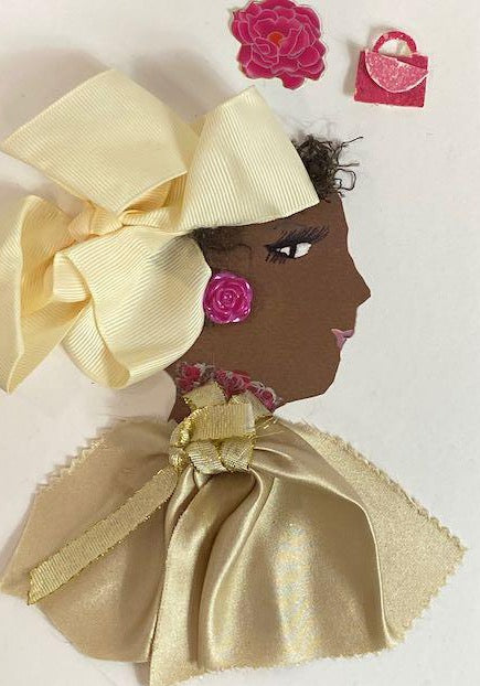 She is wearing a vanilla coloured head gear with calming beige top ruffled together with a gold bow. She has her pink earrings and has a pink bag and pink flower.