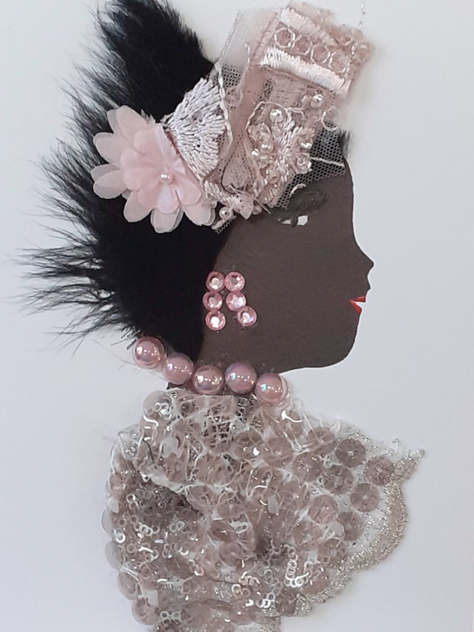Pink Peaches Nicky is wearing a blush blouse to match her blush headpiece that also has some pink flowers within it. She has matching pink pearl jewllelery.