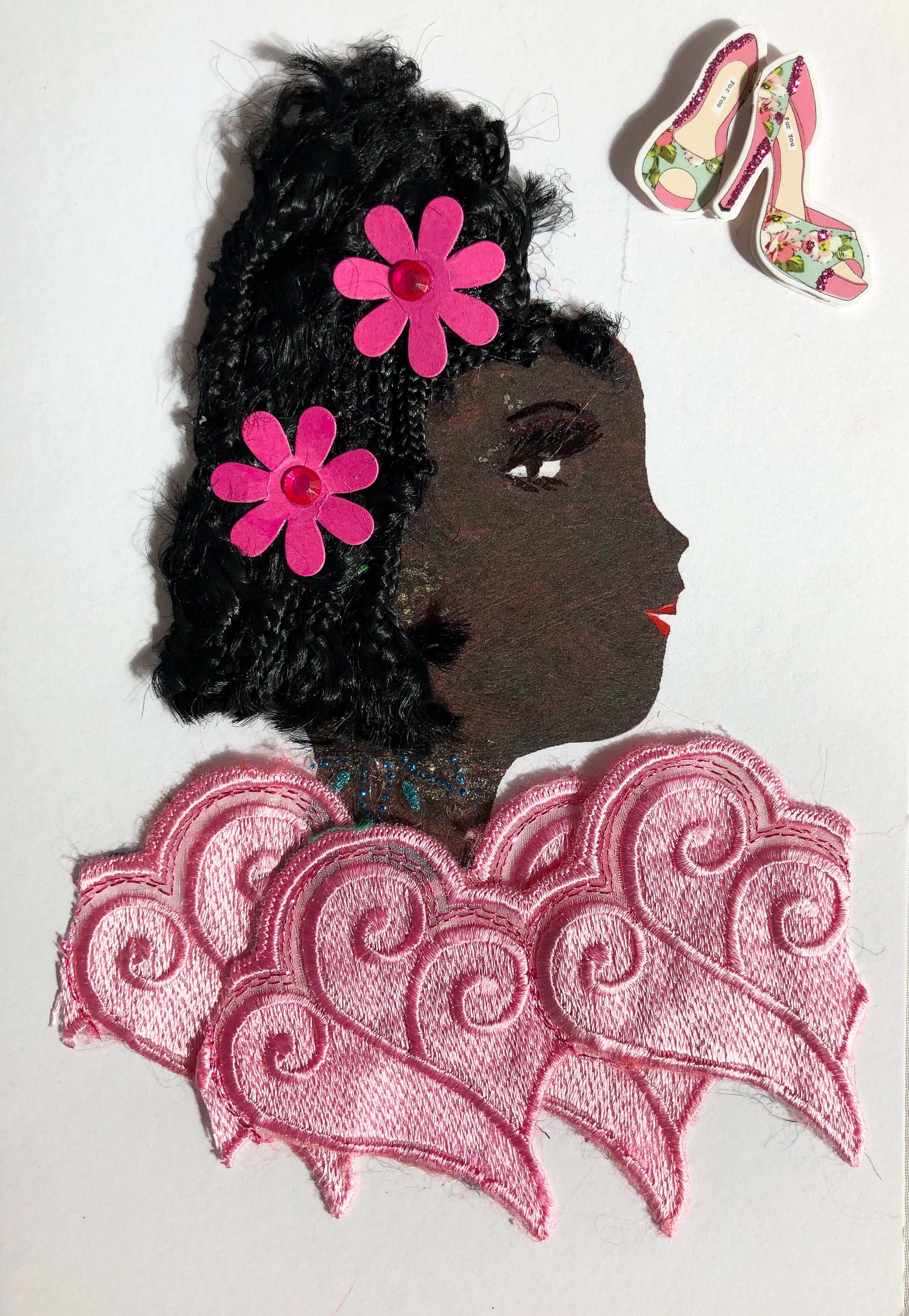 Peggy Pinner is a trendy woman with curly hair bunched up to the sky, with two large flowers in her hair. She is wearing a baby pink coloured blouse. She has a nice pair of shoes to the right of her head.