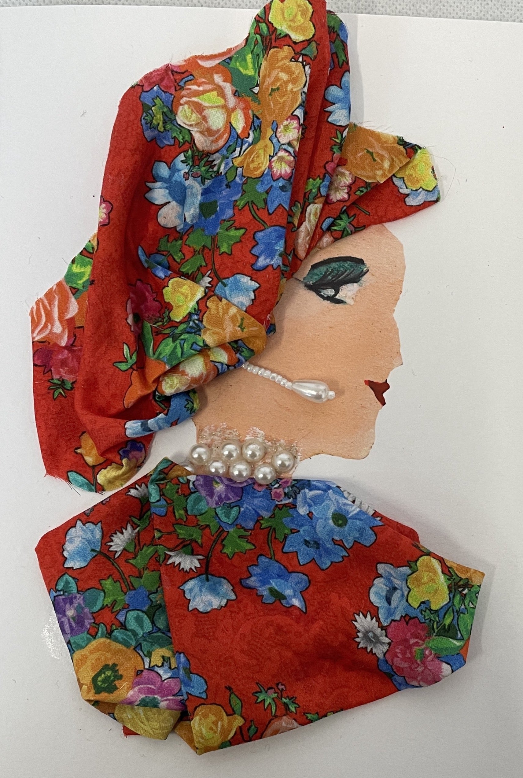 Kelly Kookaburra is wearing a lovely red Italian printed blouse and head wrap. She is wearing beautiful pearl jewellery. She has a microphone attached to her ear.