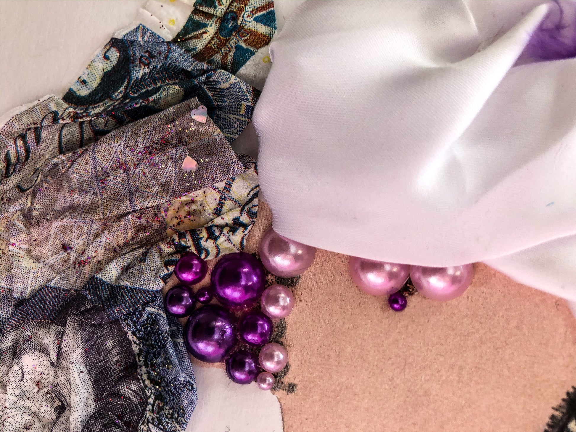 This lady is dripping in purple. Her blouse is multi-coloured with matching purple and silver jewelry. Her headpiece is white with purple flowers and jewels within it.