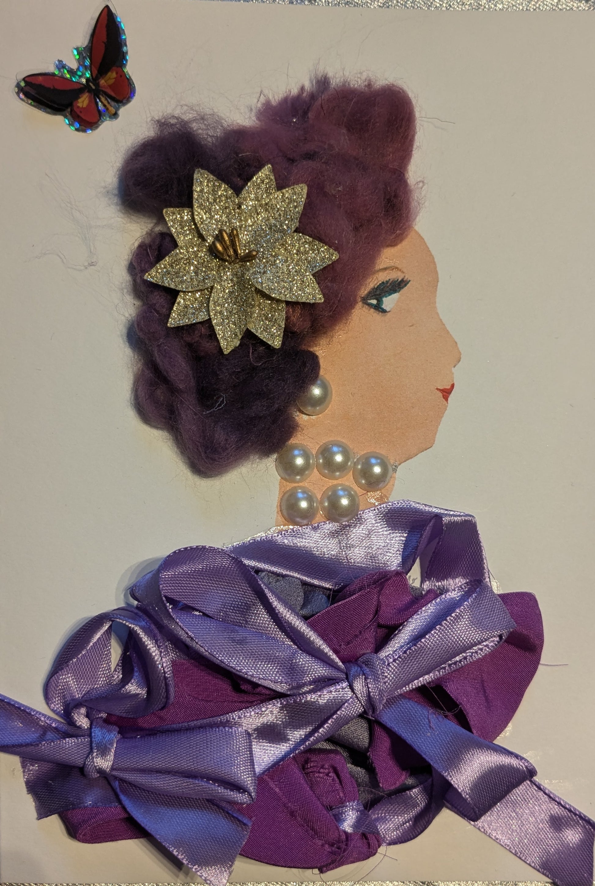 I made this handmade card. she has Puffy pink hair with gold flower and pearl jewellery wearing a purple blouse.