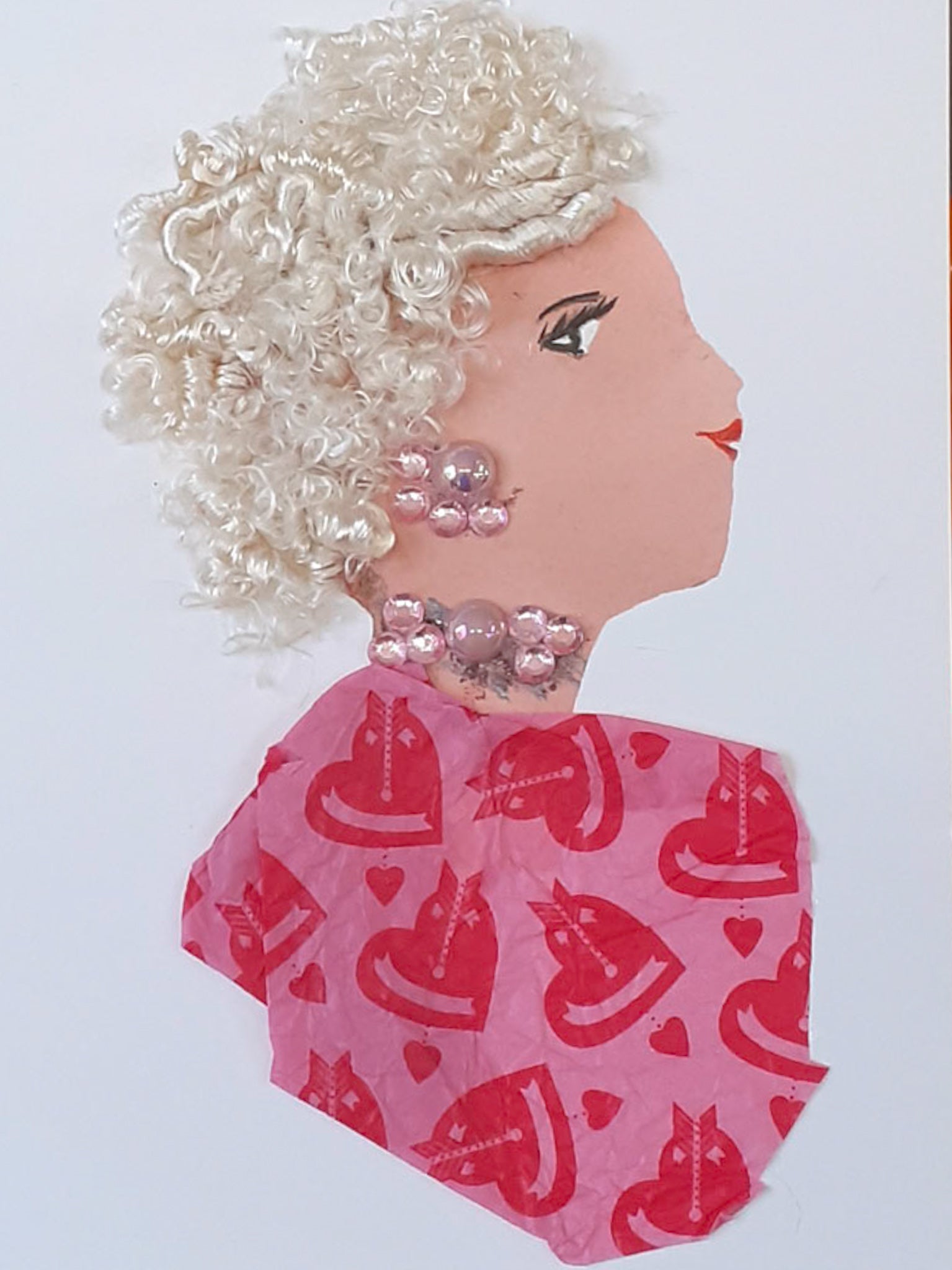 She is wearing a pink-coloured heart patterned blouse with pink pearl-type earrings. She has curly blonde hair.