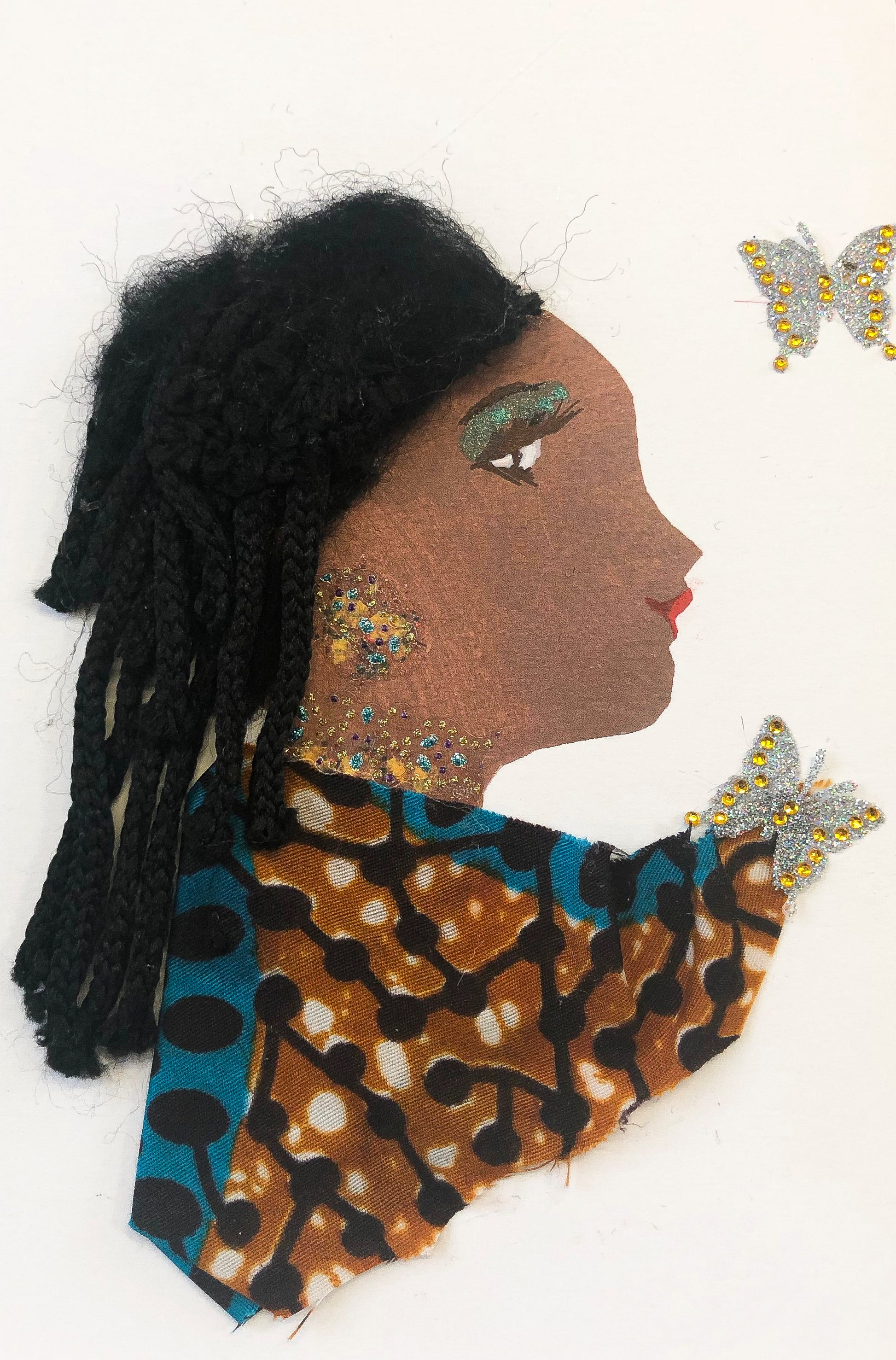 She is wearing a brown and blue coloured patterned blouse. There are two gold butterflies around.