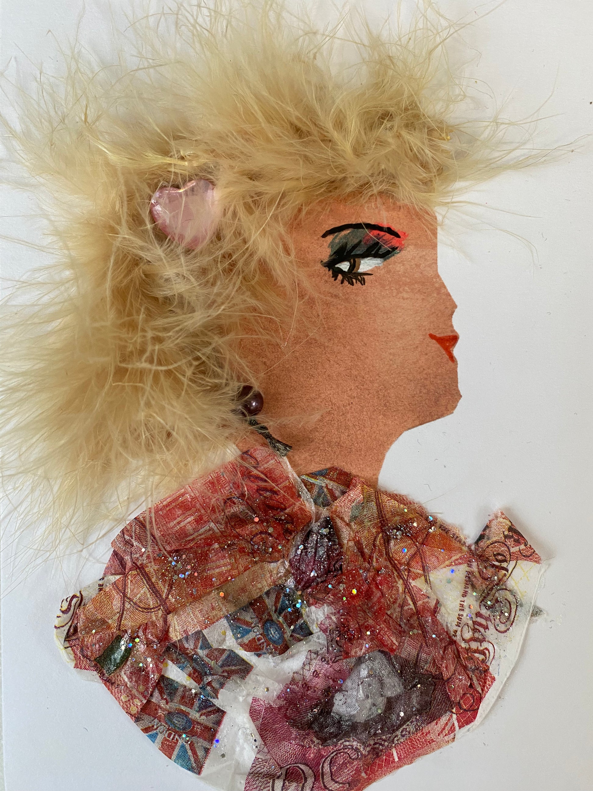 This card is designed for a woman who is wearing a money-print blouse. She has fluffy, eccentric blonde hair. There's a pink heart pin in her hair.