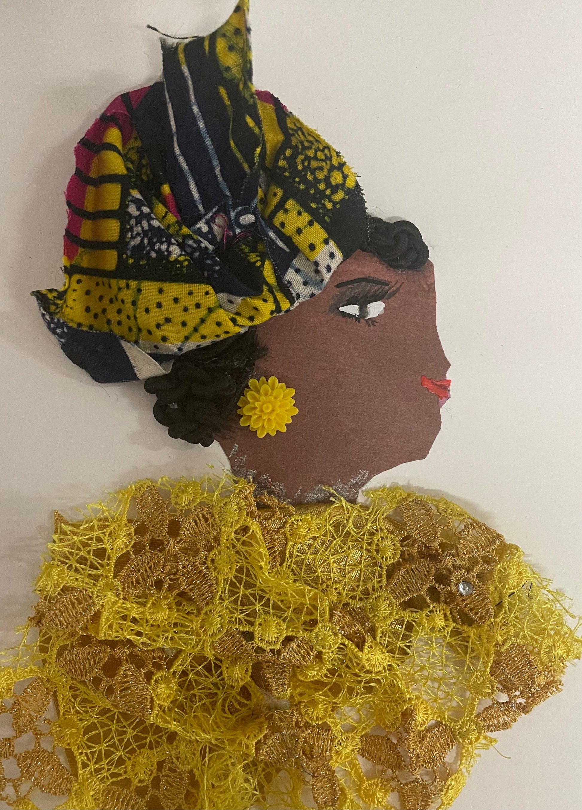 Stonebridge Sunflower is wearing a yellow blouse with yellow flower earrings. She wears a yellow Kente printed headpiece to match her yellow aura.