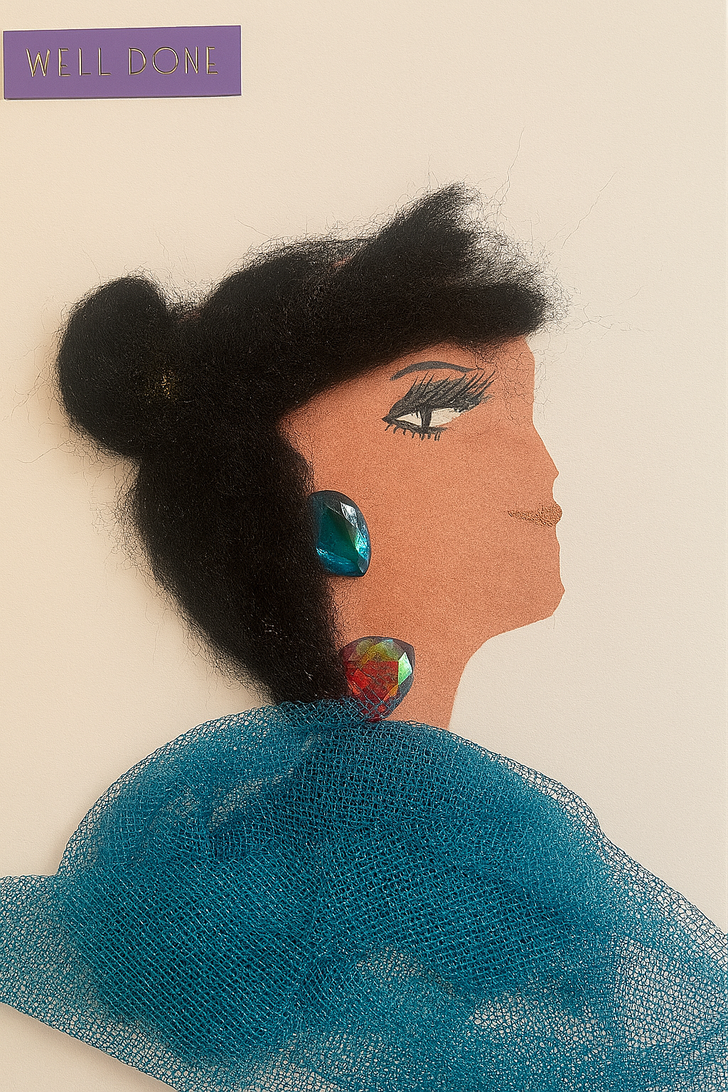I made this handmade card of a woman named Tazmine Thames. Her super cool textured tulle wrap floats around her like waves, contrasting with the soft bun and bold jewels in this sleek, elegant look. A "Well Done" sticker can be found floating gracefully in the top left corner.