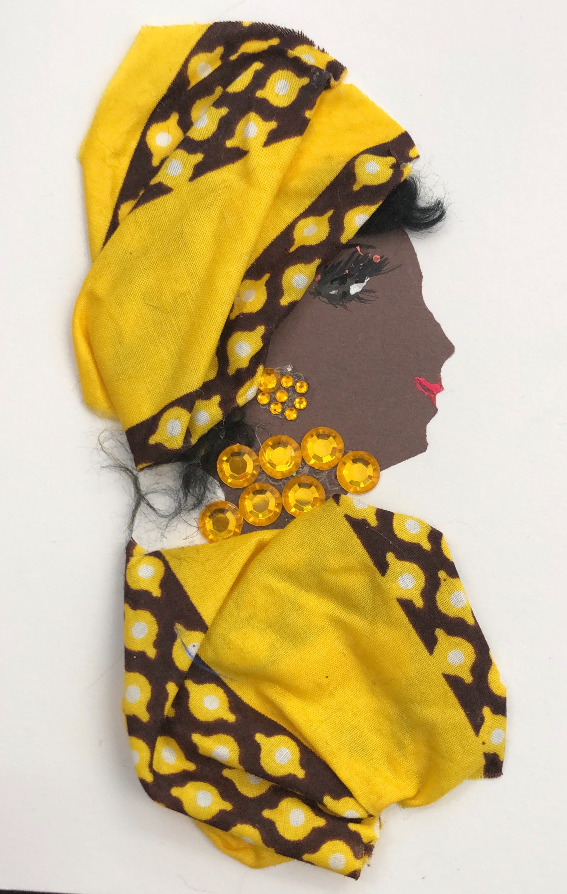 She is wearing a yellow and brown headwrap with a matching print for her blouse. She has golden earrings with a big gold necklace.