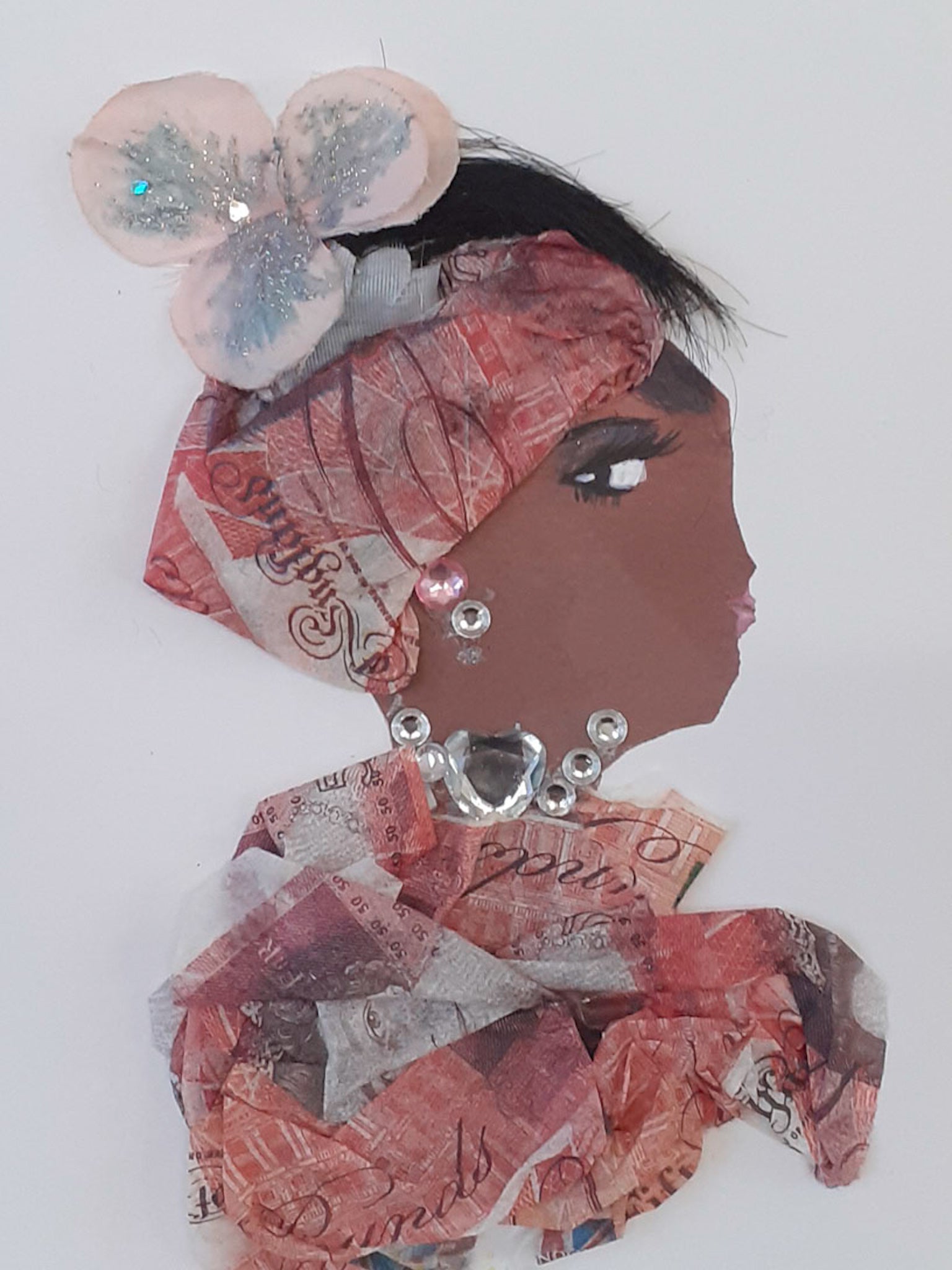 Monument Money is wearing her money print blouse and headpiece with a pink flower on her hat to keep her hair in place.