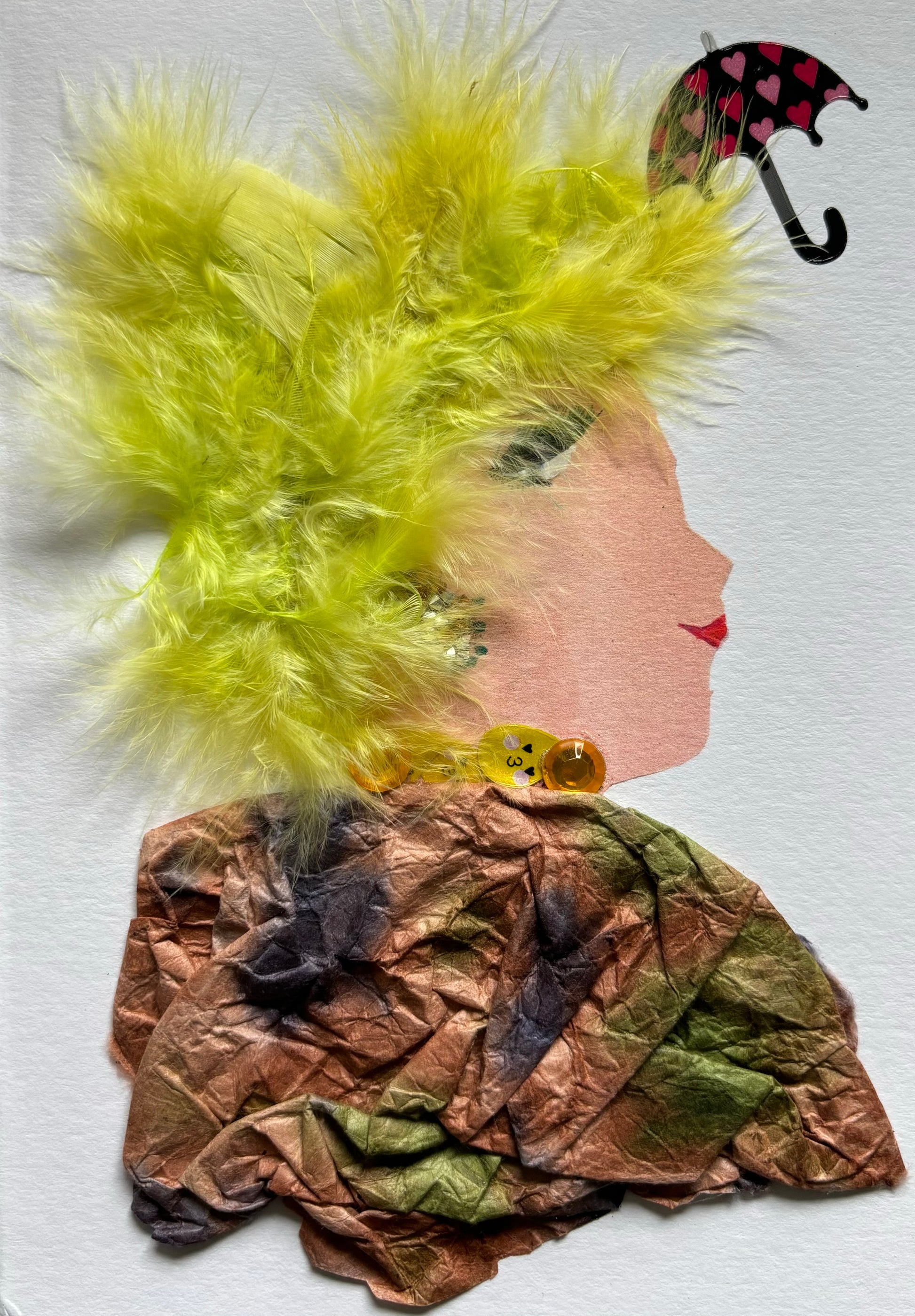 This card is dedicated for a woman who is wearing a brown, green, and black blouse with a yellow beaded necklace. She has light green hair. There is an umbrella at the top right of the card.