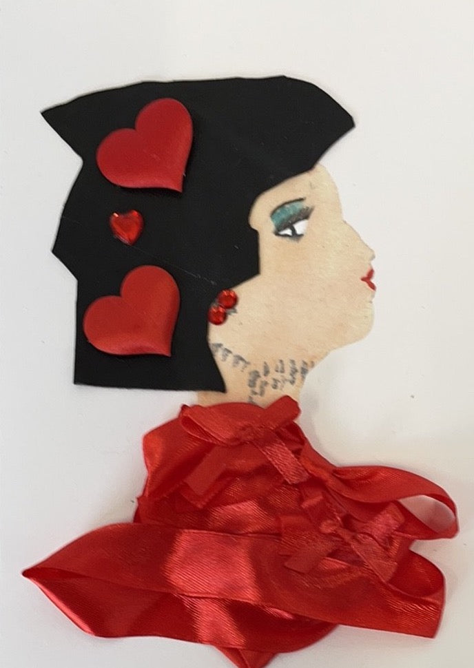 Francesca Banjo is wearing an elegant satin red blouse. She has simple silver jewellery on and is wearing a black hat with red hearts on it.
