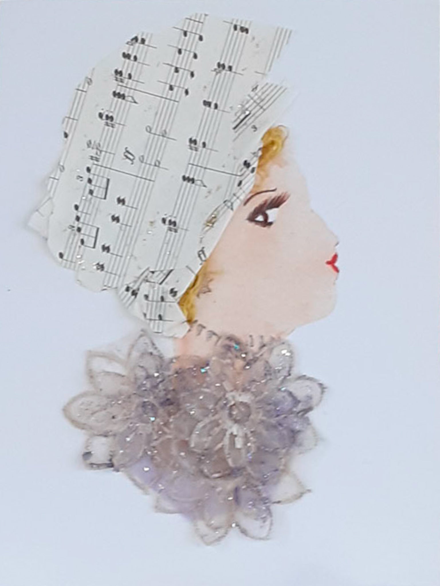 She is wearing her quirky music hat with her hair peeping out. Her flowery purple top is unique