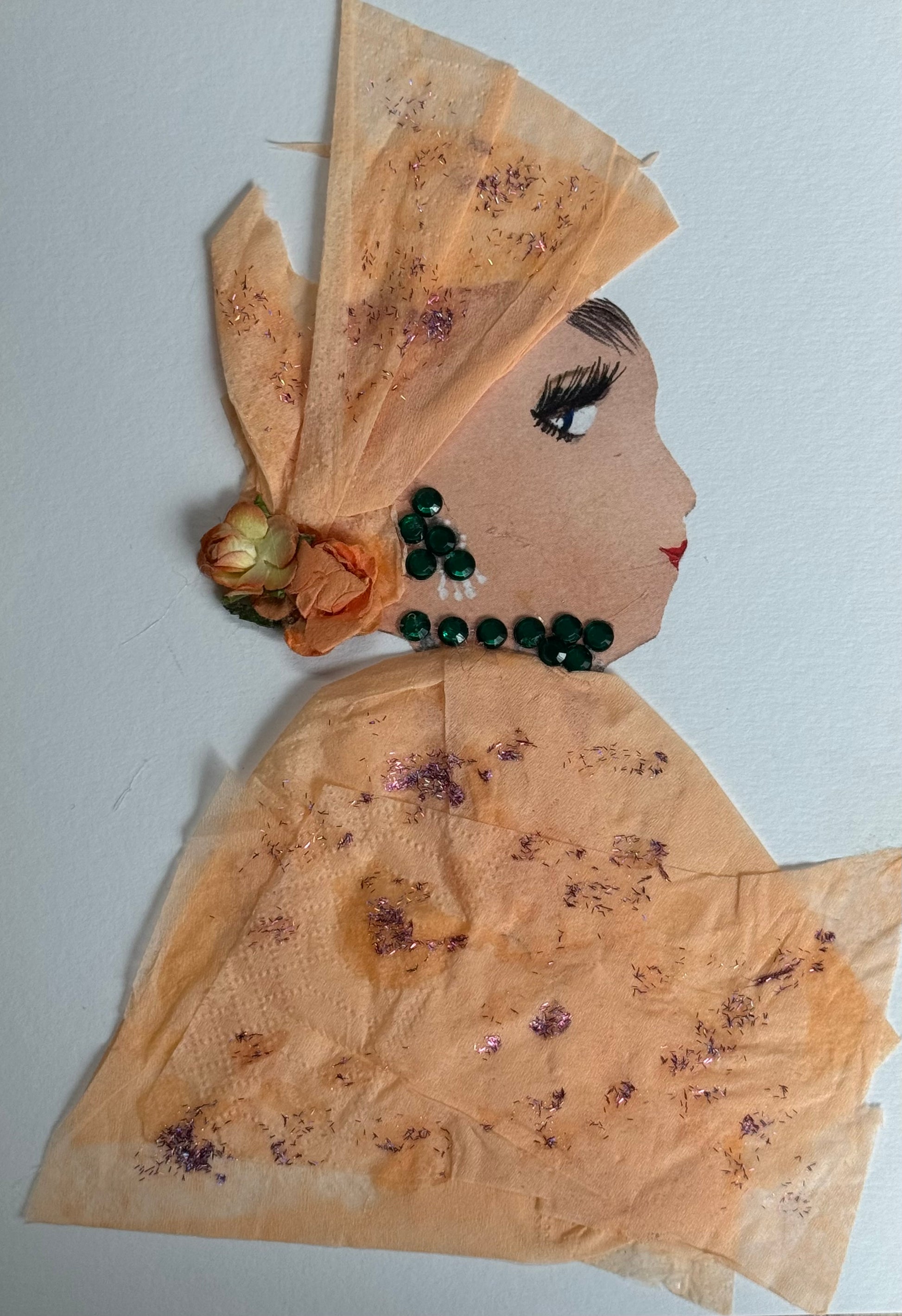 I made this card of Winnie glows in layered peach tones, her outfit crafted from delicate fabric sprinkled with soft pink glitter. Her structured headwrap is topped with tiny orange roses, and bold emerald-green gems as a necklace and earrings.